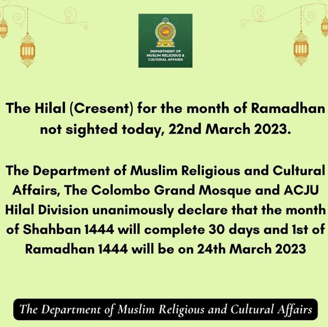 මුස්ලිම් ආගමික හා සංස්කෘතික කටයුතු දෙපාර්තමේන්තුව, කොළඹ මහා පල්ලිය සහ ACJU හිලාල් කොට්ඨාසය ඒකමතිකව ප්රකාශ කරන්නේ Shaban 1444 දින 30 සම්පූර්ණ කරන බවත් 1444 රාමසාන් 1 වන දින 2023 මාර්තු 24 වන දින බවත්ය.