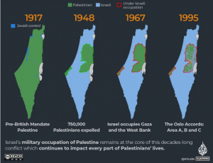 සියොන්වාදී ව්යාපාරය ඓතිහාසික පලස්තීනයෙන් සියයට 78ක් අල්ලා ගත්තේය. ඉතිරි සියයට 22 දැන් වාඩිලාගෙන සිටින බටහිර ඉවුර සහ වටලනු ලැබූ ගාසා තීරයට බෙදා ඇත.