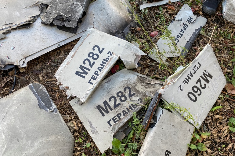 உக்ரேனிய அதிகாரிகள் ஈரானில் தயாரிக்கப்பட்ட ஷாஹெட்-136 ஆளில்லா விமானம் என்று கருதும் ஆளில்லா வான்வழி வாகனத்தின் (UAV) பாகங்கள், எரிபொருள் சேமிப்பு வசதிகள் மீதான ரஷ்ய தாக்குதலுக்குப் பிறகு காணப்படுகின்றன [Vitalii Hnidyi/Reuters] ]