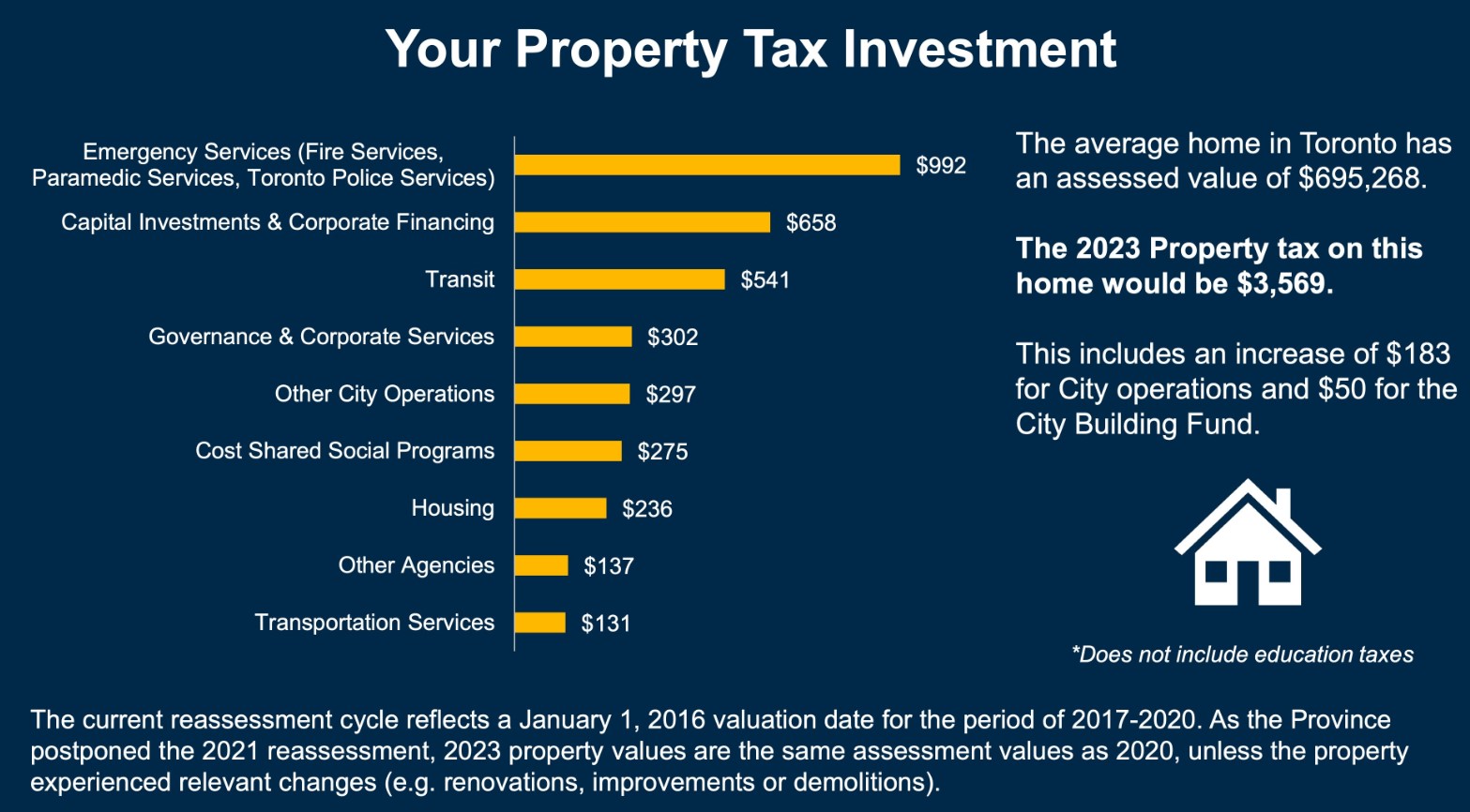 2022 ஆம் ஆண்டில், டொராண்டோவின் சொத்து வரி அதிகரிப்பு 2.9 சதவீதம் மற்றும் 1.5 சதவீதம் நகர கட்டிட வரி அதிகரிப்பு ஆகும். இது சராசரி வீட்டு உரிமையாளரின் பில் சுமார் $140 உயர்ந்துள்ளது. கூடுதலாக, 2023 வரவு செலவுத் திட்டத்தில் நீர், கழிவு நீர் மற்றும் திடக்கழிவுகளுக்கு மூன்று சதவீத வரி அதிகரிப்பு முன்மொழியப்பட்டுள்ளது என்று டோரி கூறினார். மேலும் “ஹோட்டல் வரியையும் உயர்த்தினார். வணிகச் சொத்துக்களுக்கு 2.75 சதவீதமும், தொழில்துறை சொத்துக்களுக்கு 5.5 சதவீதமும் வரி உயர்வு உத்தேசிக்கப்பட்டுள்ளது.
