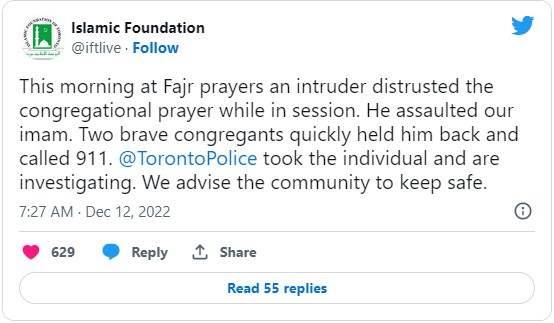 டிசம்பர் 12, 2022 – டொராண்டோ: காலை தொழுகையின் போது ஒரு இமாம் தாக்கப்பட்டதாகக் கூறப்படும் டொராண்டோ மசூதியில், வெறுப்பு ஒரு பங்கைக் கொண்டிருக்கக்கூடிய சாத்தியக்கூறுகள் உட்பட, விசாரணையில் அனைத்து வழிகளையும் ஆராயுமாறு டொரோண்டோ இஸ்லாமிய நிறுவகம் காவல்துறையினரை வேண்டியுள்ளது.