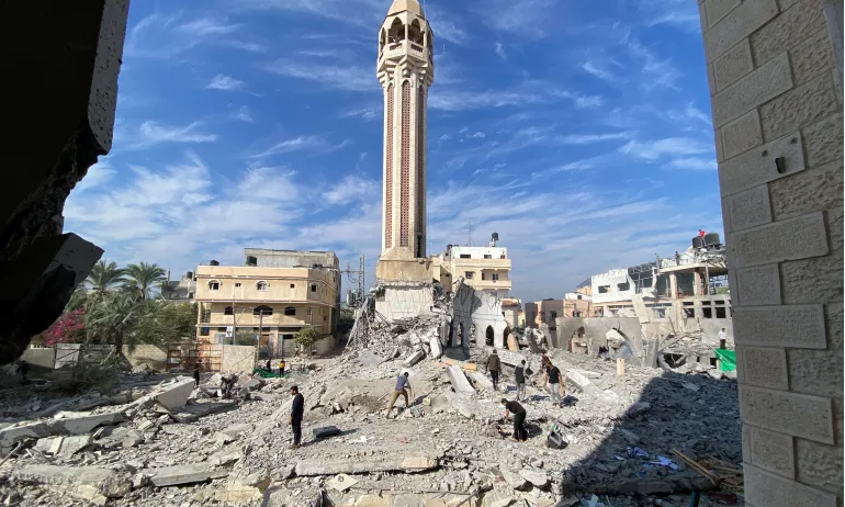 பாலஸ்தீனிய குழுவால் சமூக ஊடகங்களில் வெள்ளிக்கிழமை வெளியிடப்பட்ட காட்சிகள் மற்றும் படங்கள் காசா நகரத்தின் மிகப் பெரிய மற்றும் பழமையான கிரேட் ஓமரி மசூதி இடிந்து விழுந்ததைக் காட்டுகின்றன.